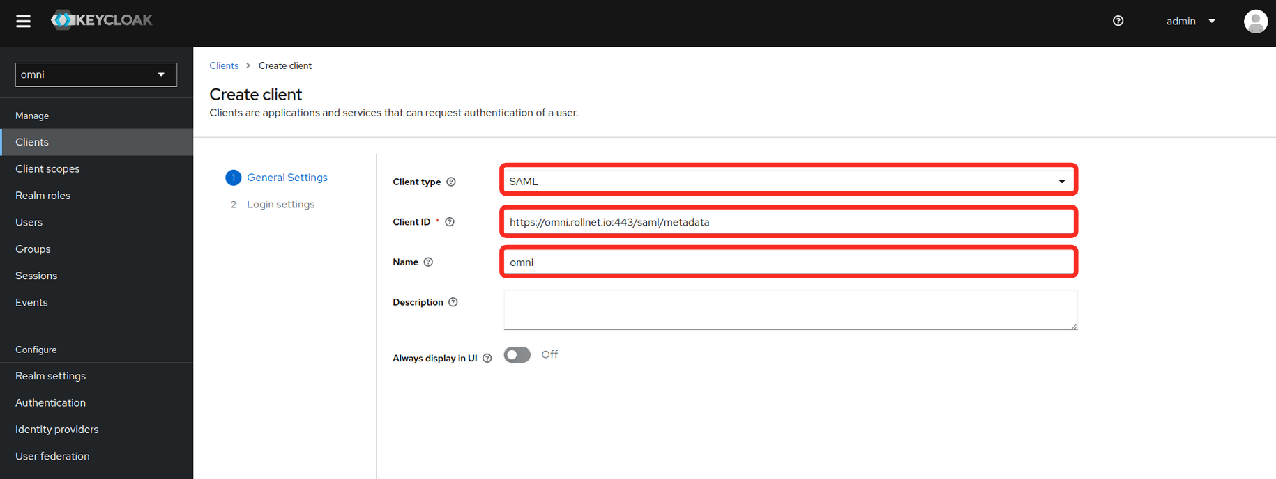 - Fill in the General Settings as shown in the example below. Replace the hostname in the example with your own Omni hostname or IP.