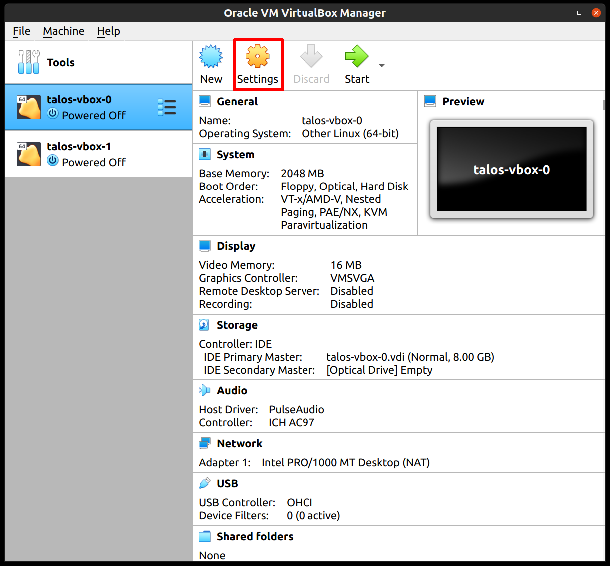 Install VirtualBox with your operating system package manager or from the website. For example, on Ubuntu for x86:Install talosctl