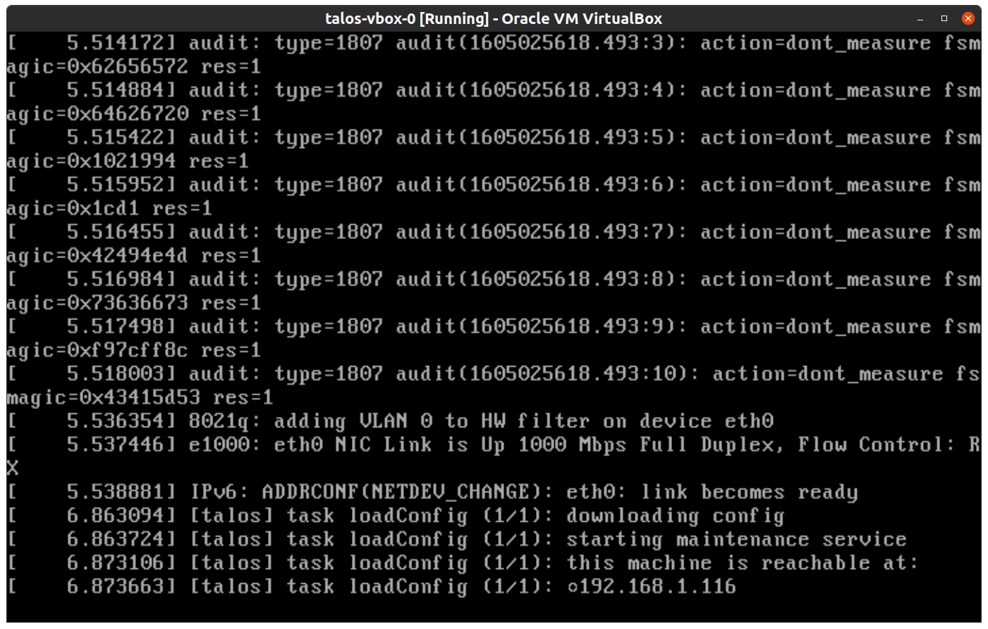 Once the VMs have been created and updated, start the VM that will be the first control plane node. This VM will boot the ISO image specified earlier and enter “maintenance mode”. Once the machine has entered maintenance mode, there will be a console log that details the IP address that the node received. Take note of this IP address, which will be referred to as$CONTROL_PLANE_IP