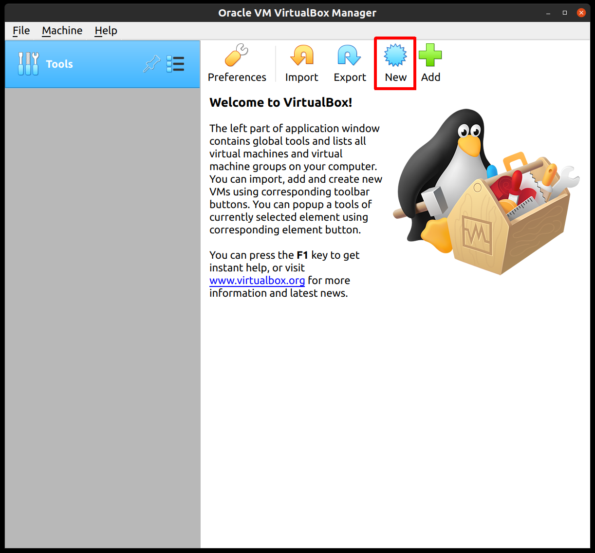 Start by creating a new VM by clicking the “New” button in the VirtualBox UI: