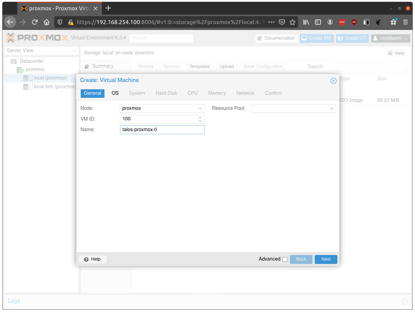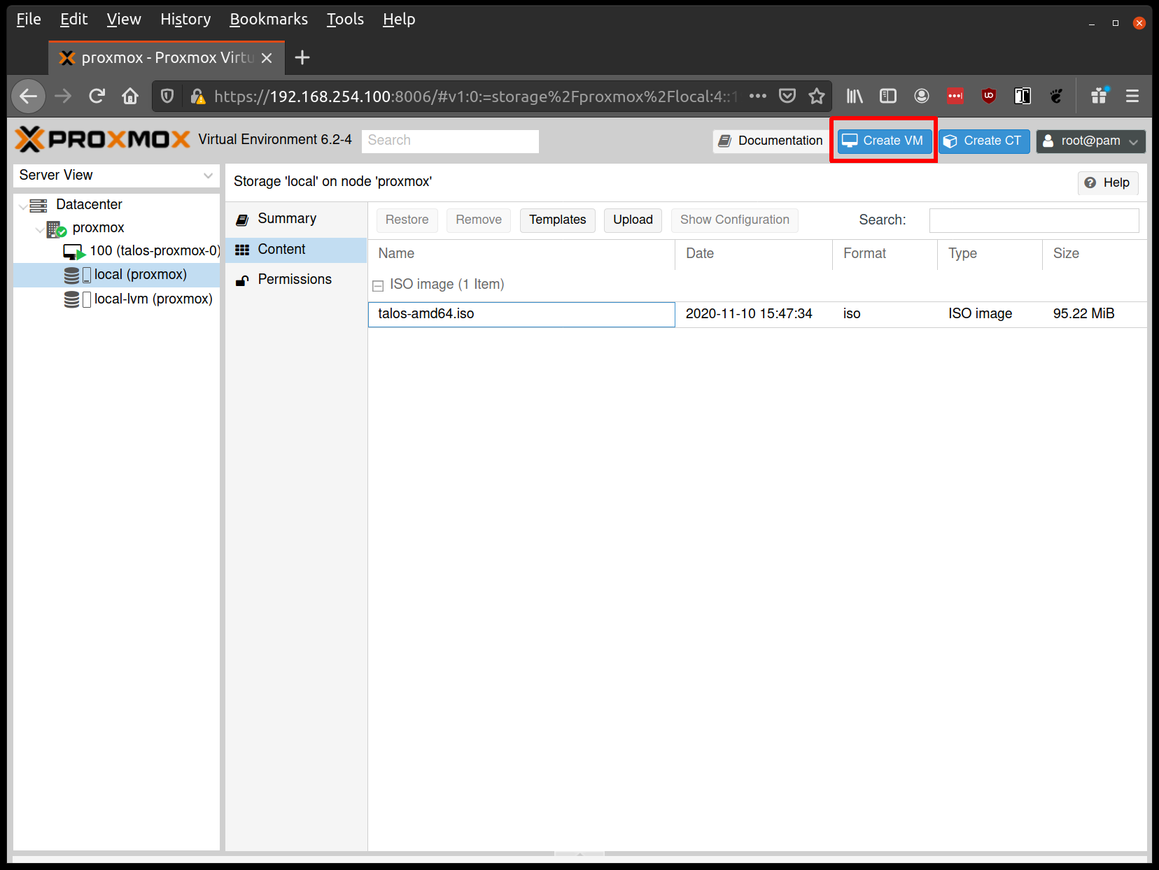 Before starting, familiarise yourself with the system requirements for Talos and assign VM resources accordingly. Create a new VM by clicking the “Create VM” button in the Proxmox UI: