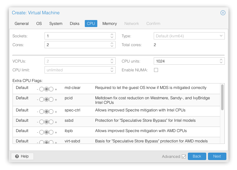 will not work. You can enable the required CPU features after creating the VM by adding the following line in the corresponding/etc/pve/qemu-server/<vmid>.conf