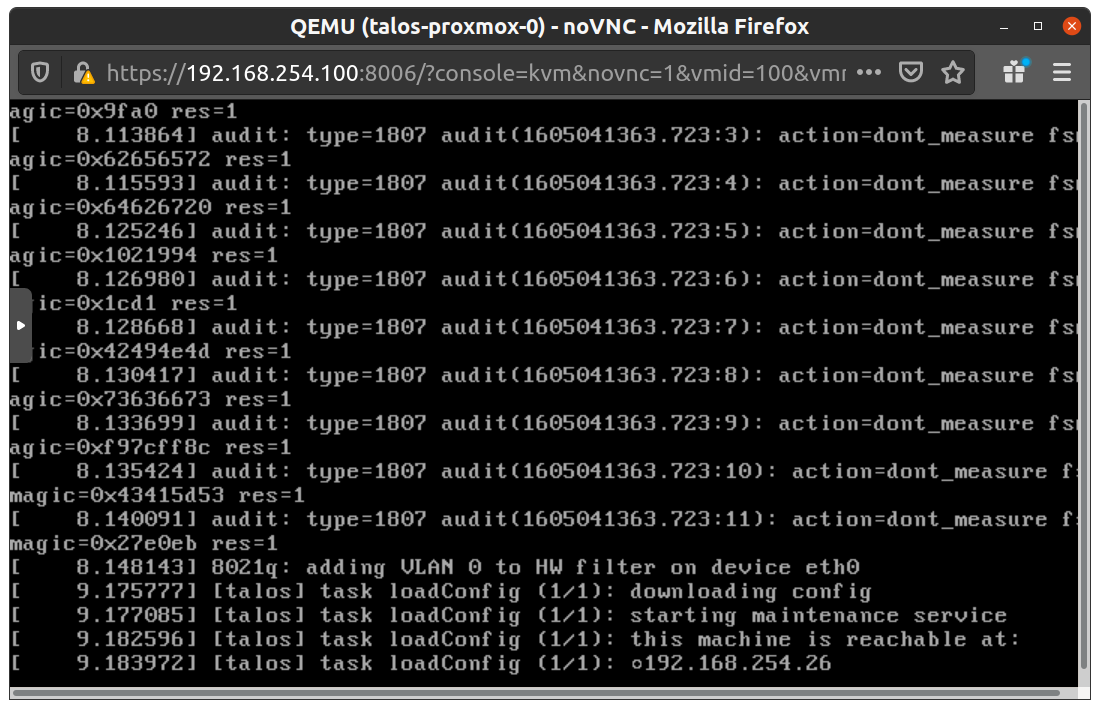 Create at least a single worker node using a process similar to the control plane creation above. Start the worker node VM and wait for it to enter “maintenance mode”. Take note of the worker node’s IP address, which will be referred to as$WORKER_IP